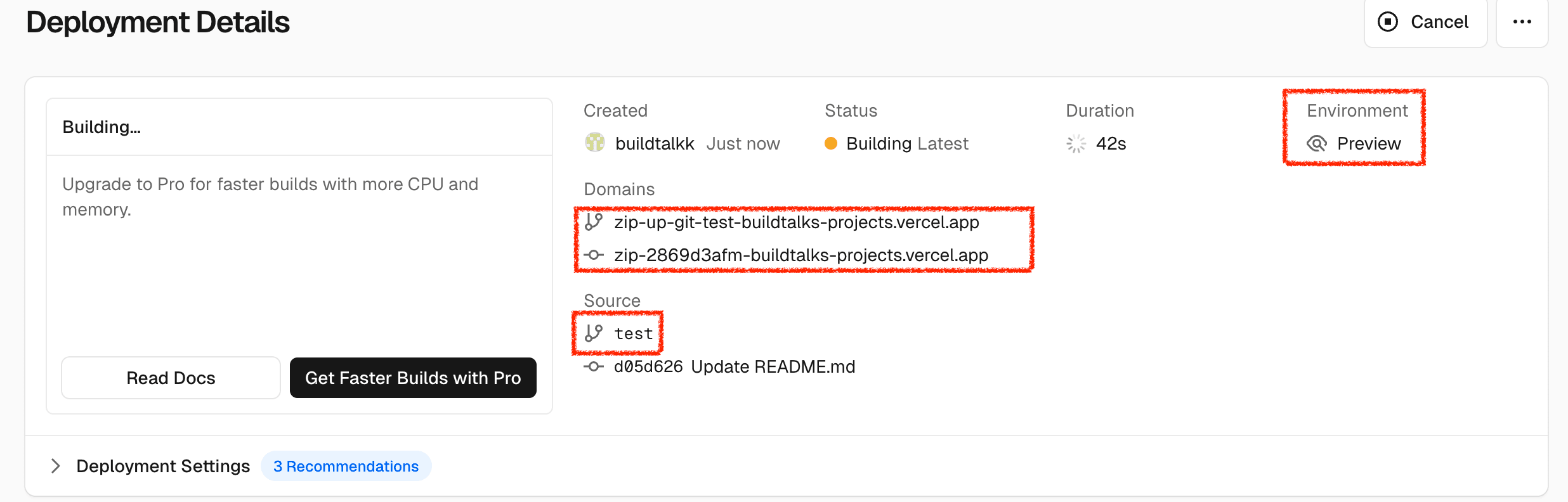 아래는 test 브랜치에서 작업한 내용이 zip-up-git-…vercel.app으로 배포되는 모습입니다.